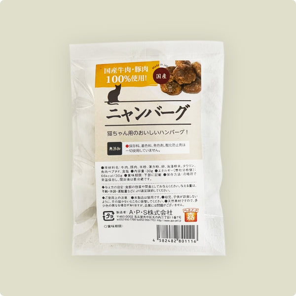 770円(税込)ネコちゃんのハンバーグだから“ニャンバーグ”!国産牛肉・豚肉を使用しています。お口の小さなネコちゃんでも食べやすいように、一口サイズです。 30gあたり66kcal(当社分析値)