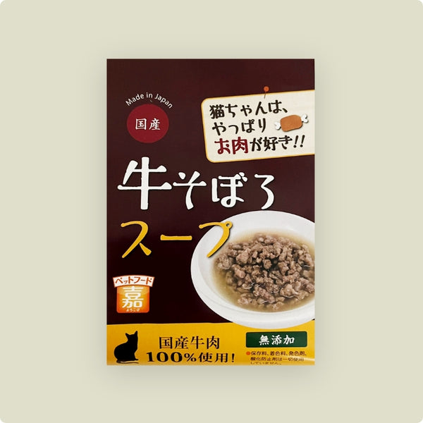 770円(税込)国産牛肉100%使用のそぼろをスープ仕立てにしました! ネコちゃんに必要なタウリン配合です。 100gあたり58kcal(当社分析値)